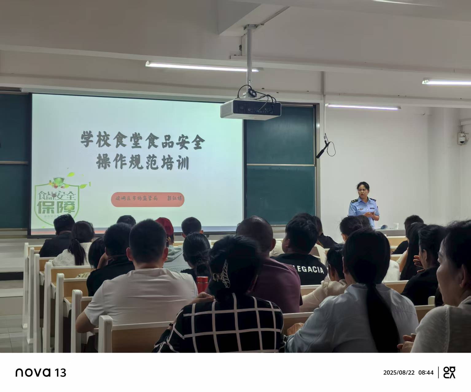 8月22日,学校后勤管理处与保卫处联合对食堂、超市、浴室等服务行业管理人员及从业人员进行了安全知识培训。