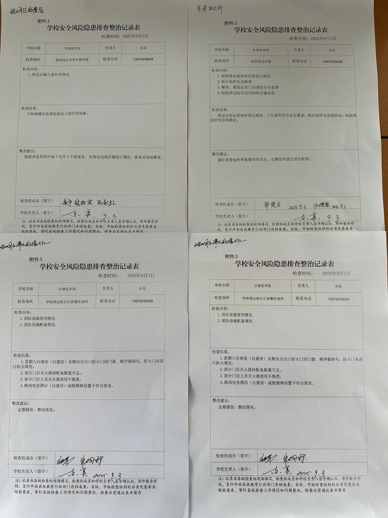 检查结束后,属地各职能部门分别梳理排查出的隐患问题,分别填写了《学校安全风险隐患排查整治记录表》,属地相关职能部门将对口督促落实隐患整改。