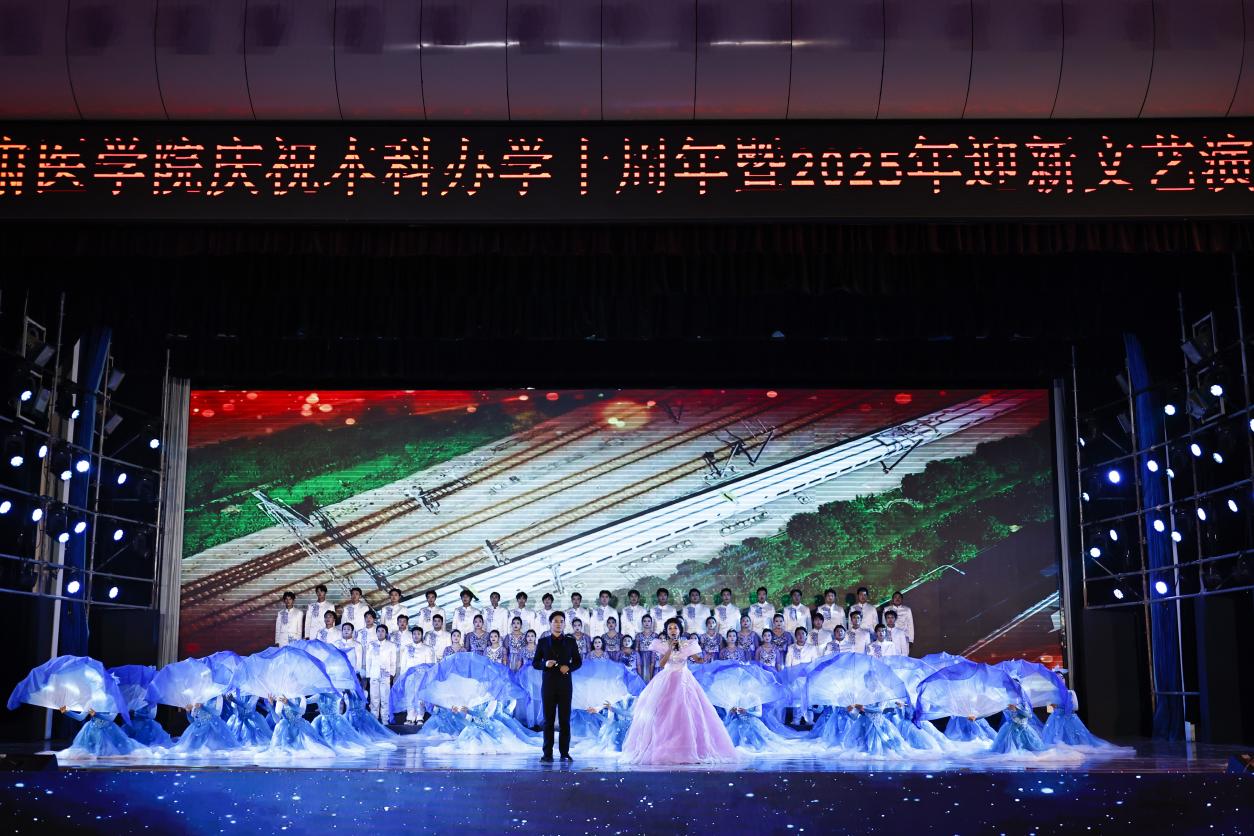 文艺演出在气势恢宏的舞蹈《盛世欢歌》中拉开序幕,展现了学校诞生于新时代背景下的蓬勃朝气。深沉隽永的诗朗诵《医路长歌·十年回响》,以饱含深情的话语娓娓道来学院十年发展的风雨历程与辉煌成就。舞蹈《授护·守护》则通过艺术化的肢体语言,庄重演绎了护理学专业神圣的授帽仪式和护理工作者守护生命、无私奉献的职业精神。民乐合奏《象王行》以恢弘大气的旋律,彰显了学校坚定前行的气魄。情景剧《青春的选择》生动再现了甘医学子毕业后毅然选择扎根基层、服务人民的坚定决心,体现了学校人才培养的鲜明导向。活力四射的歌曲串烧《正青春》,唱出了青年学子的蓬勃朝气与昂扬斗志。独唱《杏林银针》以悠扬的歌声,艺术化的展现了皇甫谧银针济世的仁心仁术,赞颂了医者的大爱情怀。舞蹈《绽放》以优美的舞姿寓意学校事业与学子梦想的绚丽绽放。情景合唱《圆梦时代》将现场气氛推向高潮,表达了师生身处伟大时代、共筑中国梦的豪情。最后,晚会在激昂奋进的歌伴舞《我们的中国梦》中圆满落下帷幕,歌声与舞蹈交织出甘医人迈向新征程的坚定信念与无限希望。