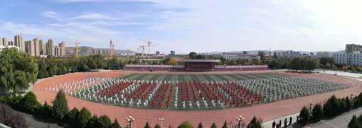 接到学院工作安排后,公课部高度重视,积极行动,拟定了工作方案,成立了筹备工作领导小组。邀请两名资深教练对我院武术协会学生代表进行培训,由体育教研室5名教师负责组织全体学生学习分解动作和队列联排。750名学生和训练教师利用课余时间,经过20天的紧张排练,组成了“交响丝路·问道崆峒”中的“响”字方阵,于10月20日早圆满完成了平凉市万人崆峒太极拳展演活动。学生们在悠悠的太极拳音乐声中缓缓起势,揽雀尾、闪通背、金龙出水、白鹤亮翅……大家精神抖擞、全神贯注,一招一式打出了崆峒武术的底蕴精神,一眼望去,蔚为壮观。