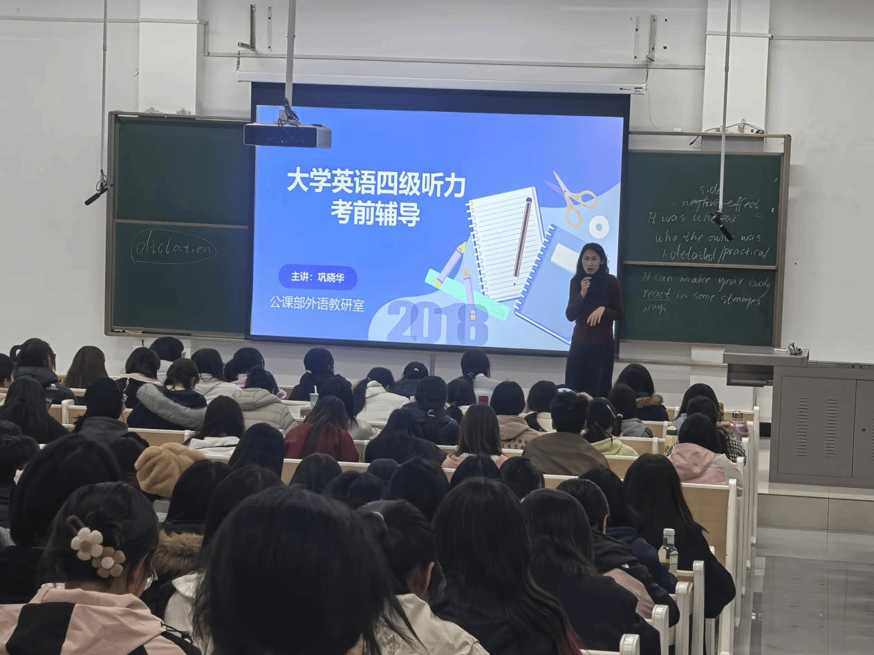 为助力我校学生备战大学英语四级考试,有效掌握应试技巧和答题方法,提高英语四级考试成绩,公共课教学部精心筹划,组织安排了8位经验丰富的外语教师于近日开展大学英语四级考前系列辅导讲座。首次四级听力专项辅导于11月10日晚在一号教学楼第二大教室开讲。