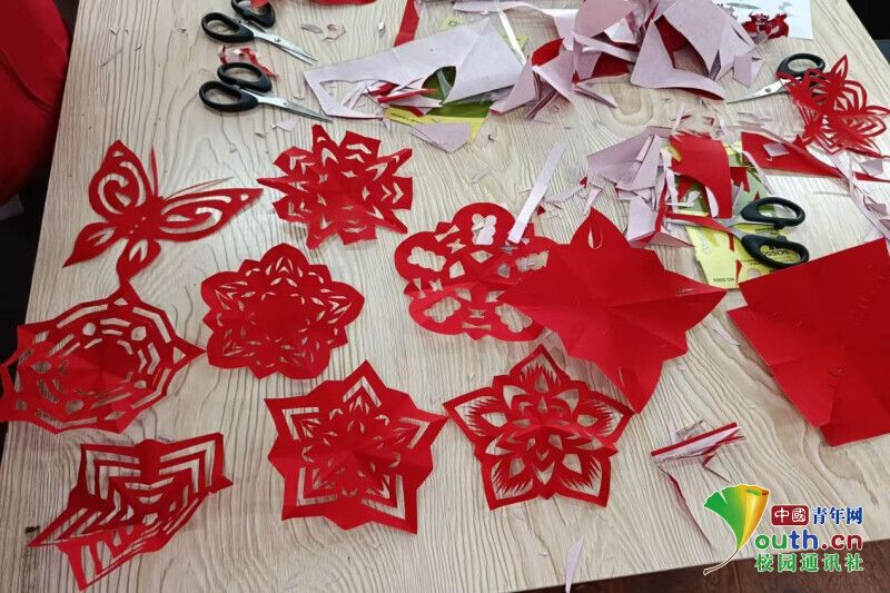 图为团队成员在非遗传承人的指导下完成的剪纸作品。 王嘉琪 供图