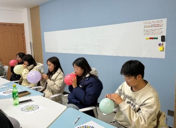 护理学院心理专干虎亚馨老师强调,活动要本着保密与尊重包容的原则,营造温馨舒适的良好交流氛围。在“曼陀罗填色”环节,同学们跟随心情自由选择颜色,放慢呼吸,排除杂念,让注意力完全沉浸在填色动作中;在“压力气球”环节,同学们将“压力源”以文字形式写在气球上,通过吹起气球,实现压力的具象化释放。学生们分享自身克服压力的经历,提供解决问题的有力参考,最后,虎亚馨总结梳理克服压力的方法,让学生们了解科学减压方法并实际运用到日常生活学习中。