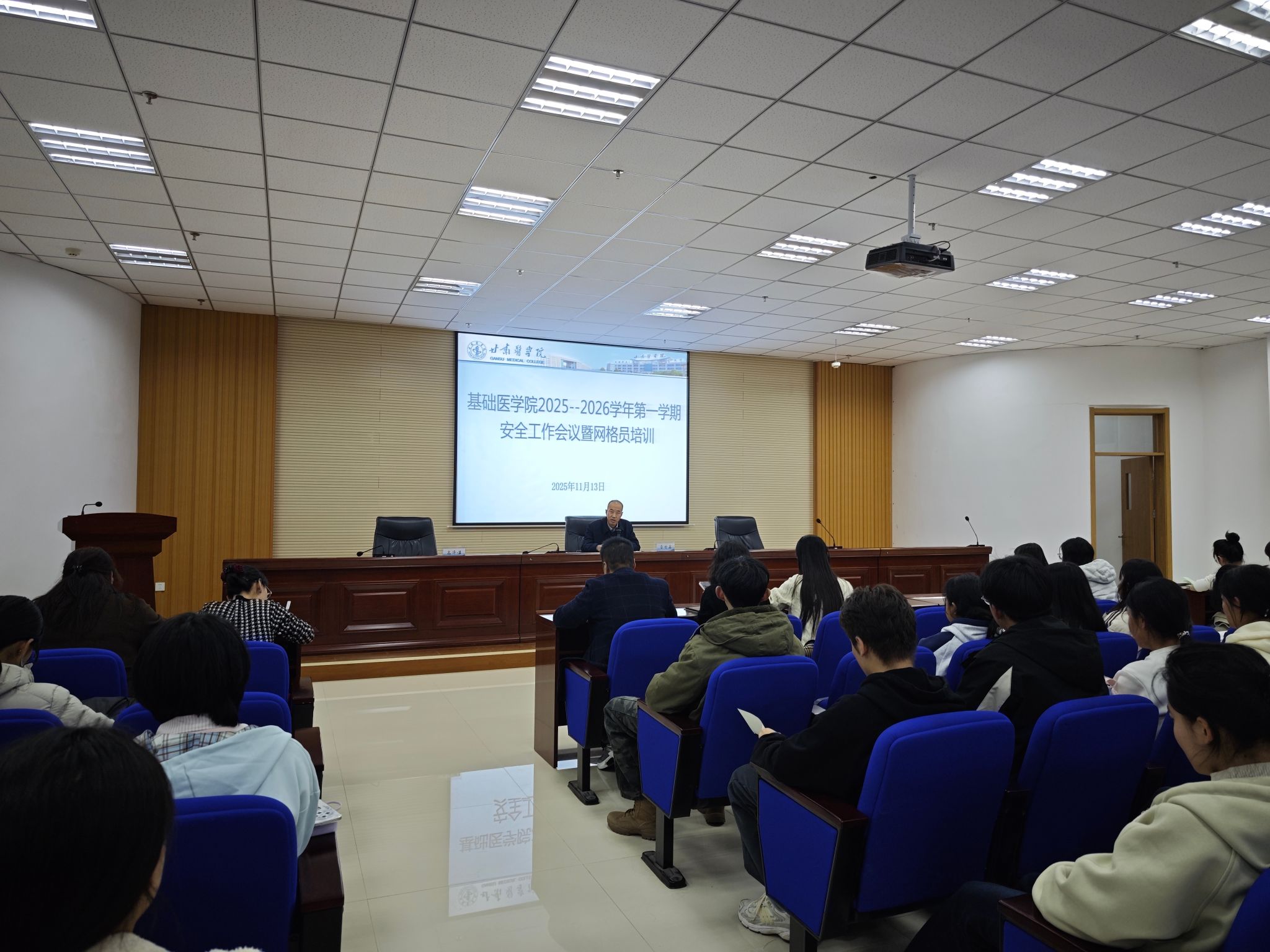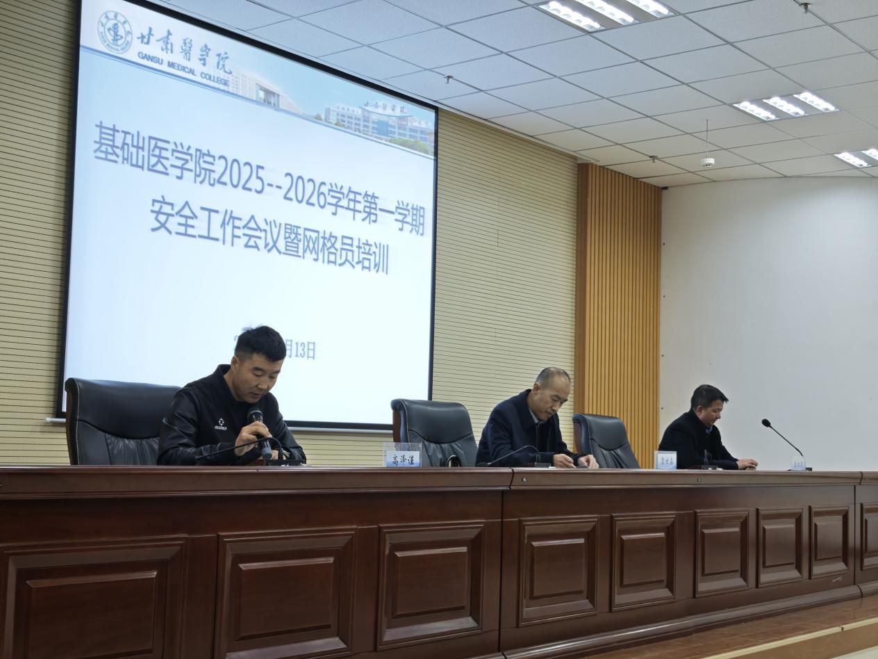 为深入贯彻落实学校安全专项整治工作部署要求,进一步健全学生工作网格化管理体系,夯实安全育人工作根基,11月13 日晚上,基础医学院在二号教学楼B座8楼报告厅组织召开2025-2026学年第一学期安全工作会议暨网格员培训会。会议由学生科科长高泽谨主持,学院党总支书记雷世鑫主讲,副院长李红恩、全体班主任、辅导员及各班级微网格员参加会议,凝聚育人共识,明确安全工作重点。