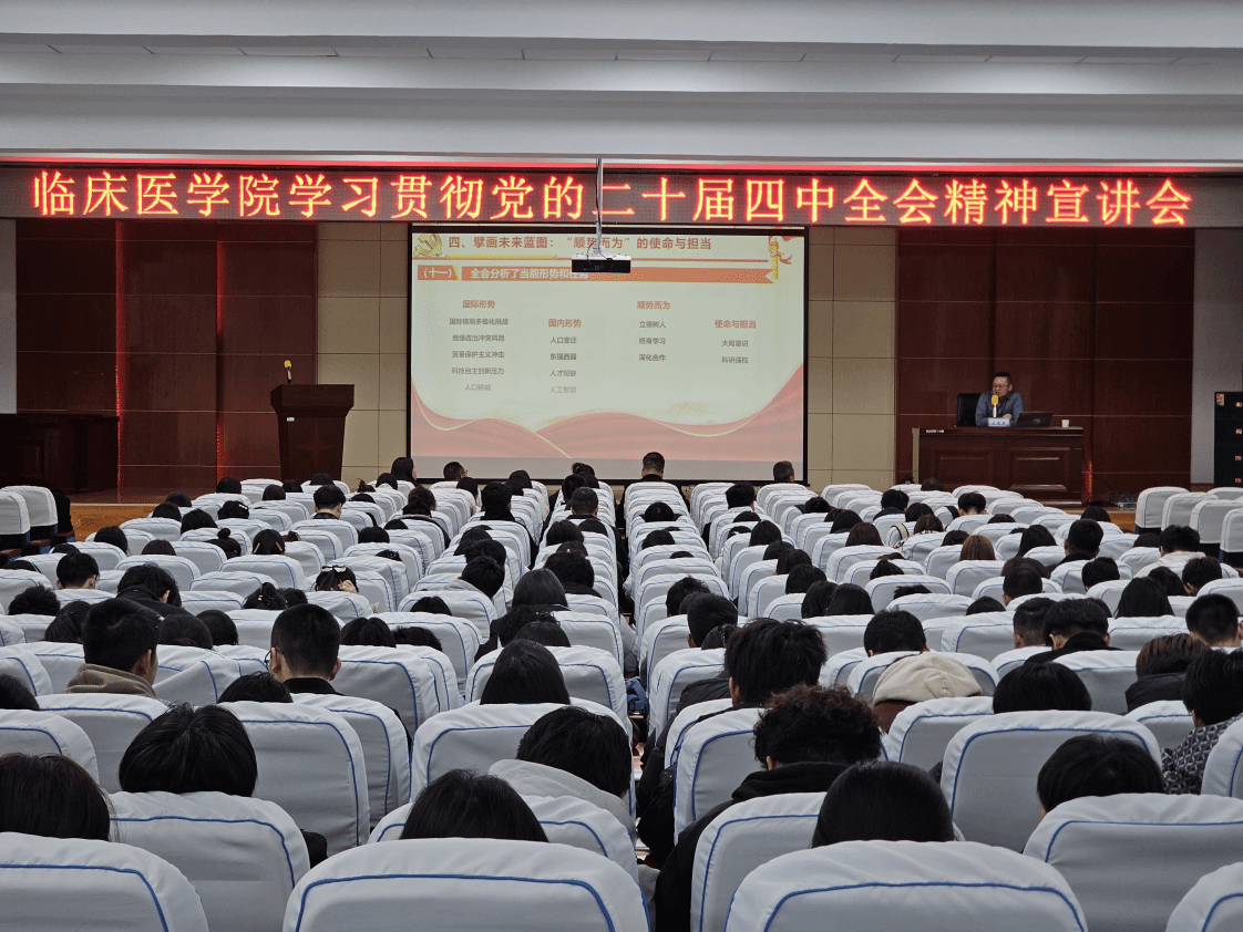 此次宣讲会的召开,为临床医学院全面推进二十届四中全会精神学习贯彻工作拉开了序幕,进一步统一了全院师生的思想认识,营造了浓厚的学习氛围。学院将以此次学习为契机,齐心协力,凝聚共识,将全会精神转化为推动学院高质量发展的强大动力,为培养更多应用型医学人才贡献力量。