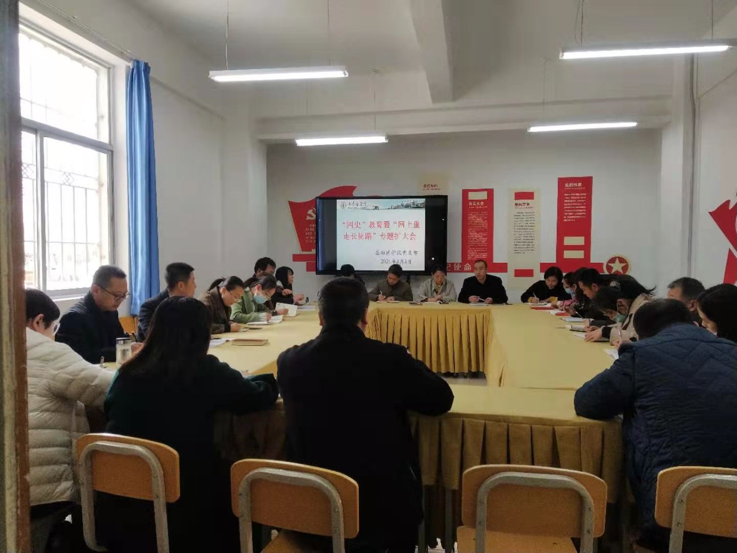 2021年3月2日,基础医学院组织召开全体党员、部门管理人员和教研室主任参加的党支部扩大会议,学习了《甘肃医学院关于开展“四史”教育暨“网上重走长征路”甘肃段活动实施办法》;安排了下一阶段的学习工作;观看了《为了和平》第二集《殊死较量》。