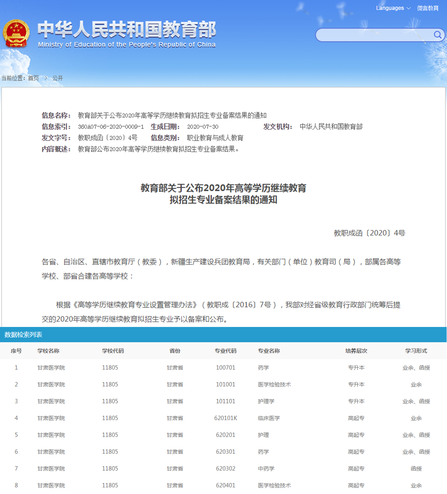 日前,教育部公布了2020年高等学历继续教育拟招生专业备案结果的通知,我院申报的护理学、药学两个专升本函授专业和护理、药学、中药学三个高起专函授专业成功获批,学制2.5年,将于今年开始招生。至此,学院专升本专业已增至5个,专科专业增至7个。