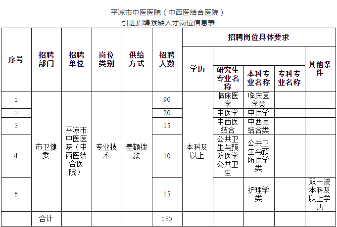 本次计划引进招聘紧缺专业技术人才150名,具体岗位详见《平凉市中医医院(中西医结合医院)引进招聘紧缺人才岗位信息表》(附件1)。