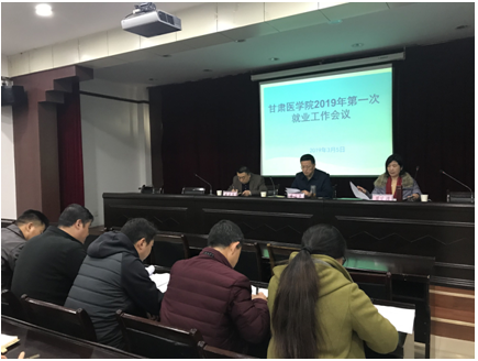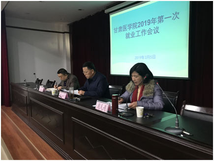 2019年3月5日上午10点,甘肃医学院2019年第一次就业工作会议在在第二会议室顺利召开。学院副书记、副院长崔安平、学生工作处处长朱天荣、招生就业处处长周凤娟、各系负责人、招生就业处全体人员参加了本次会议,会议由招生就业处处长周凤娟主持。