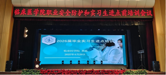 为让同学们更快地适应临床实践环境,强化职业安全意识,规范实习管理流程,临床医学院于4月29日在学校体育馆举行了2026届毕业生实习前教育培训会议。临床医学院领导、相关科室负责人、班主任、辅导员及全体实习生参加会议。