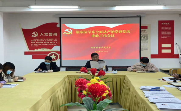 3月17日下午,临床医学系党总支召开全面从严治党暨党风廉政工作专题会议,会议由临床医学系党总支书记李宝成主持,全体教工党员参加。会议重点学习了习近平总书记在十九届中央纪委六次全会上的重要讲话精神和十九届中央纪委六次会议公报以及十三届甘肃省纪委六次全会精神。会议强调,全体党员要坚持以党的政治建设为统领,全面落实党要管党,全面从严治党责任。一要坚持党中央集中统一领导,始终在思想上政治上行动上同以习近平同志为核心的党中央保持高度一致。党员干部要加强党的建设,严格要求自己,严格遵守党规党纪,发挥带头表率作用。二要积极履职尽责、主动担当作为。发挥党员干部干事创业积极性,营造风清气正的政治环境,迎接党的二十大胜利召开。三要严格落实监管责任,紧盯就业、招生、奖助贷、实习等重点领域以零容忍的态度坚决惩治损害师生切身利益的违法违规行为和腐败问题。四要持之以恒抓好中央八项规定落实,锲而不舍纠“四风”树新风,提倡节假日廉洁过节。