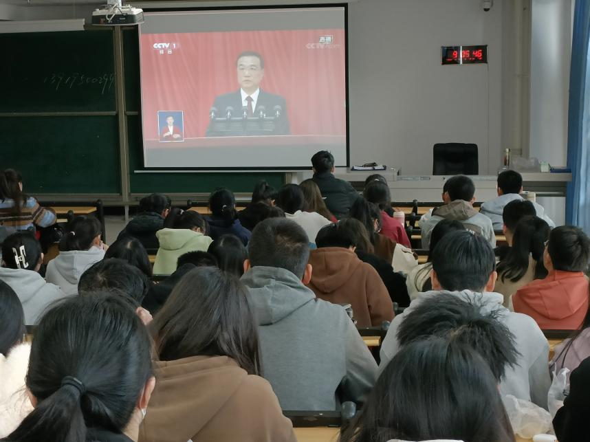 3月5日上午,第十四届全国人大一次会议在人民大会堂隆重开幕,国务院总理李克强作政府工作报告。上午9时,马克思主义学院董金玉常务副院长组织党史班学生在2号楼6大教室集体观看人大开幕会直播,第一时间学习政府工作报告,关注两会热点。
