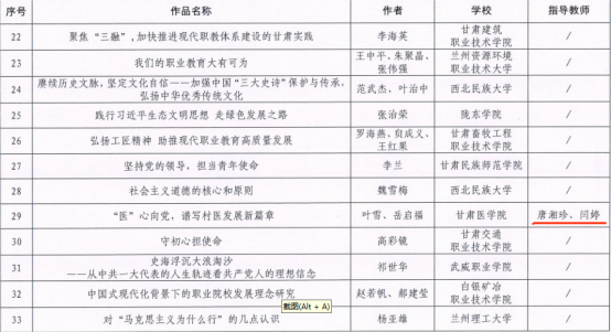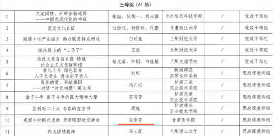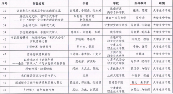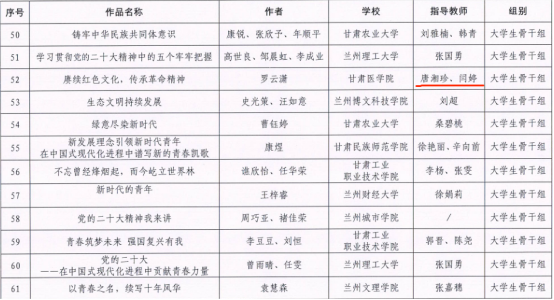 根据《中共甘肃省委宣传部中共甘肃省委教育工作委员会共青团甘肃省委关于开展“理响校园·培根铸魂”全省高校理论宣讲作品征集评选展示活动的通知》要求,在学院大力支持下,工作室成员精心指导、参赛团队悉心准备并报送了理论宣讲作品,参加了此次作品征集活动。经评审,工作室骨干成员朱章芳荣获思政课教师组微视频三等奖;工作室成员朱章芳、靳文指导的学生团队荣获大学生骨干组二等奖;工作室主持人唐湘珍指导的学生团队分别获宣讲报告组二等奖、大学生骨干组三等奖。