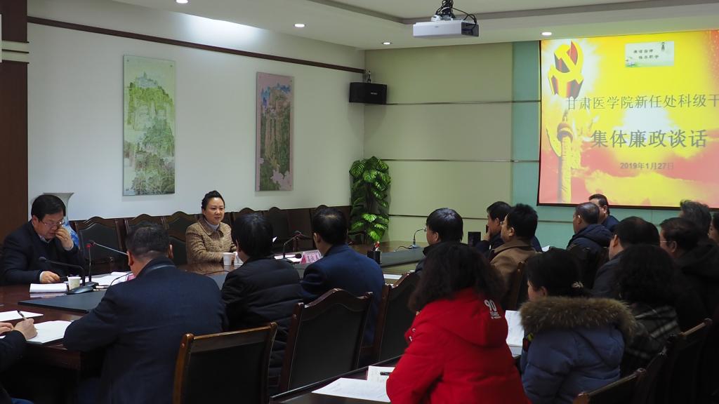 2019年1月27日上午学院召开了新任处科级干部集体廉政谈话会议。纪委书记杨建福同志主持了会议,党委书记高淑美出席了会议,42名新任职处科级干部参加了会议。