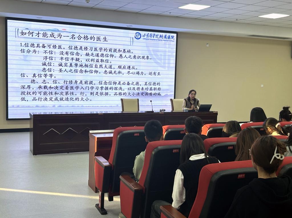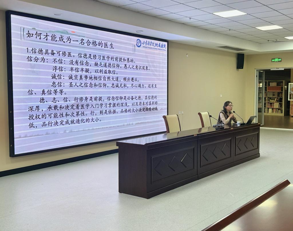 此次讲座活动中,石岩老师强调医务工作者是一个神圣而自豪的职业,生命是最宝贵的财富,而医生肩负着救死扶伤的使命,因此必须具备高度的道德品质和职业素养。她从传统角度阐述了对“医”的认识,指出医为五术之冠,岐黄源于道,修身明德而学医,深入解读了“医生、大夫”的含义,以及医生作为治病救人的重要职责。通过分享自己多年的临床经验,与大家探讨了如何成为一名合格的医生。她认为一名合格的临床医生必须医德高尚、医术精湛和艺术服务,也就是说,医生不但要有责任心、同情心和爱心,还要有渊博的知识、丰富的经验、敏锐的眼光和果断的决心,同时还要有丰厚的人文知识、良好的语言艺术,善于理解病人的语言、心情和痛苦,提出医学是一个不断发展的领域,医生需要保持终身学习的态度,不断更新自己的医学知识和技能。
