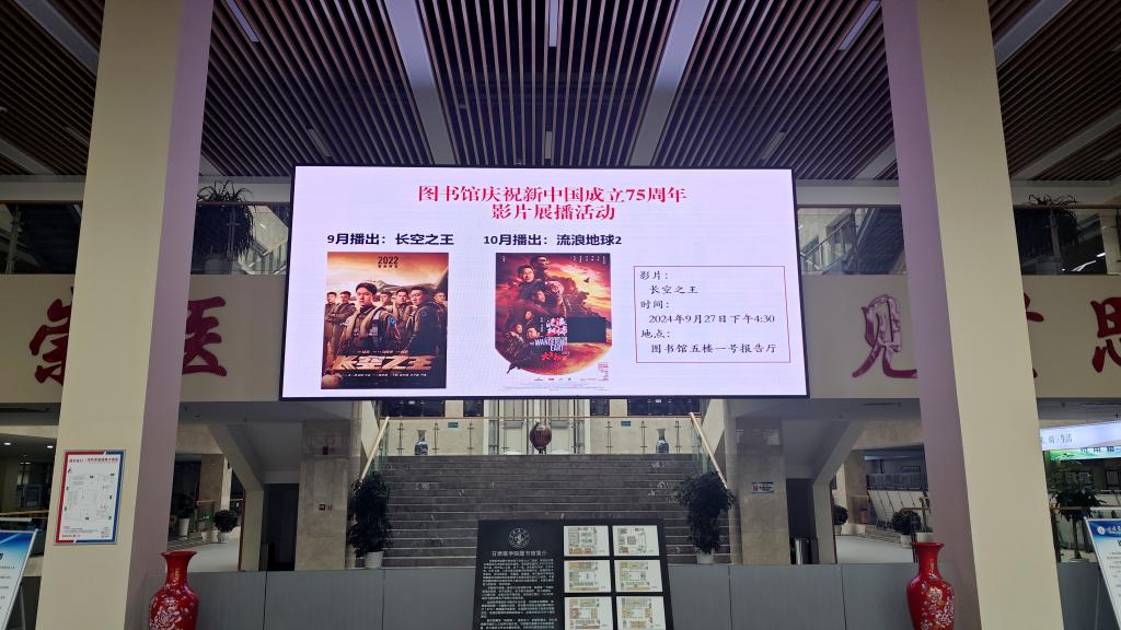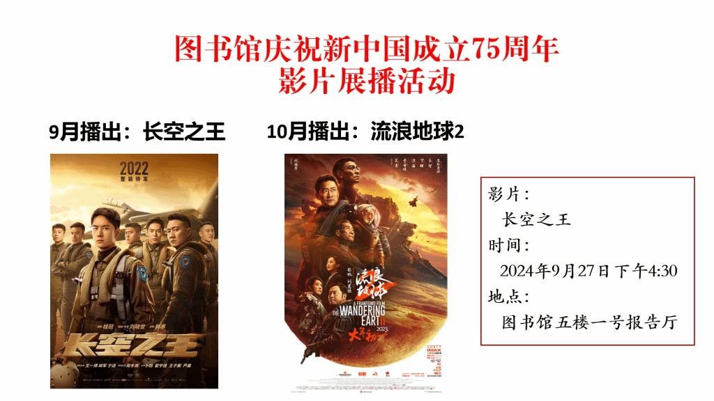 十月图书馆将继续播放影片《流浪地球2》,欢迎广大师生前来观看。