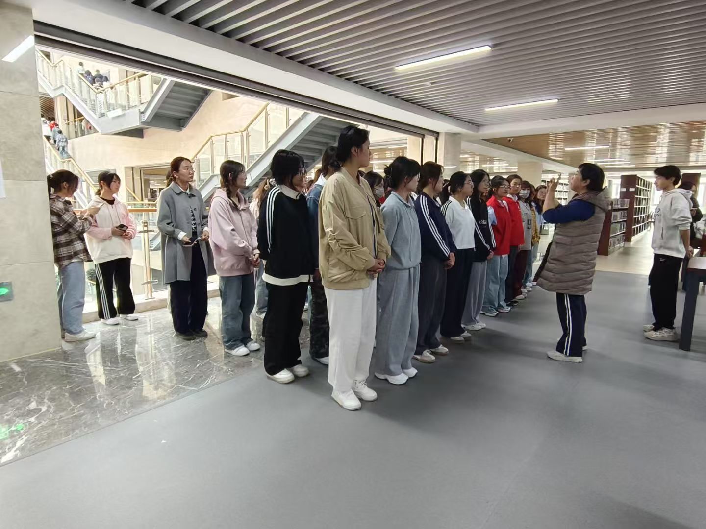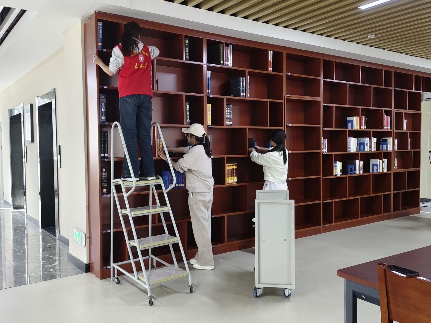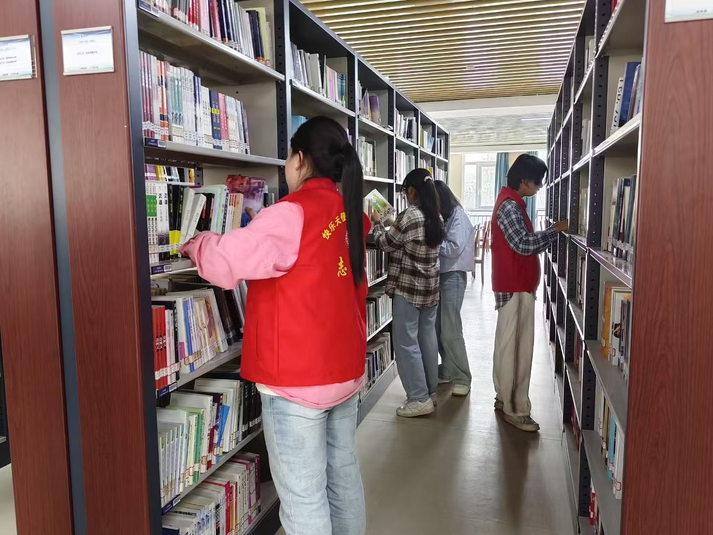 在图书馆工作人员的悉心指导下,志愿者们明确各自职责,有序地投入到志愿服务当中,仔细检查每一本书籍的摆放位置,将错架、乱架的书籍一一归位,并认真擦拭书架上的灰尘,确保书架整洁干净,为读者提供舒适的借阅环境。