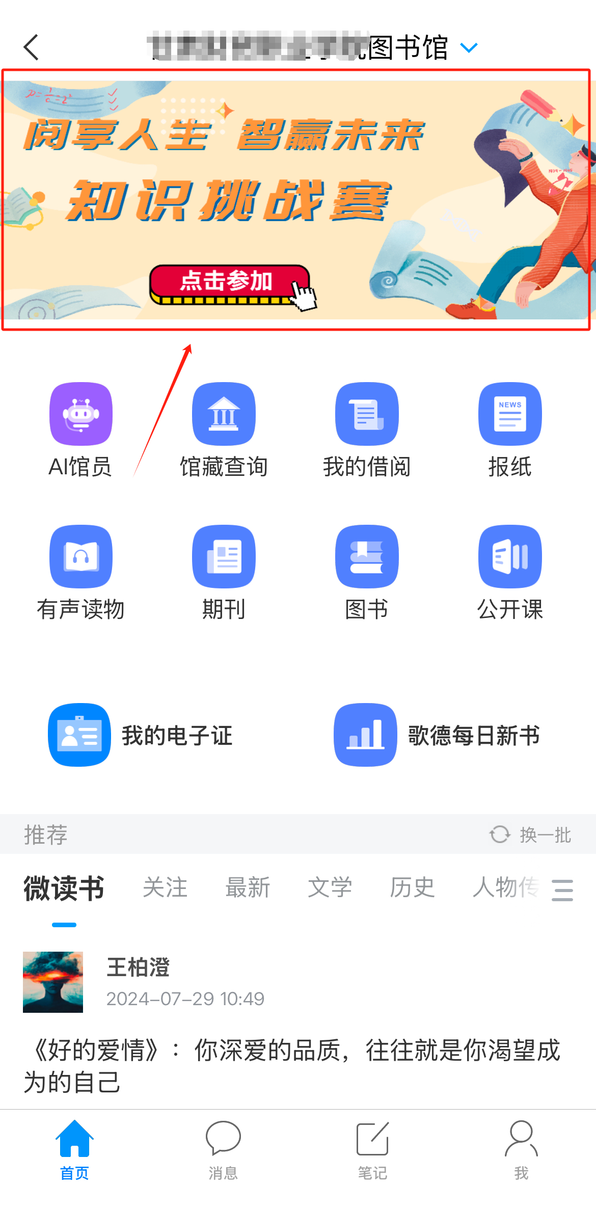 方法二:读者使用手机号注册或登录,进入移动图书馆首页,找到答题模块/点击首页轮播图参与活动。