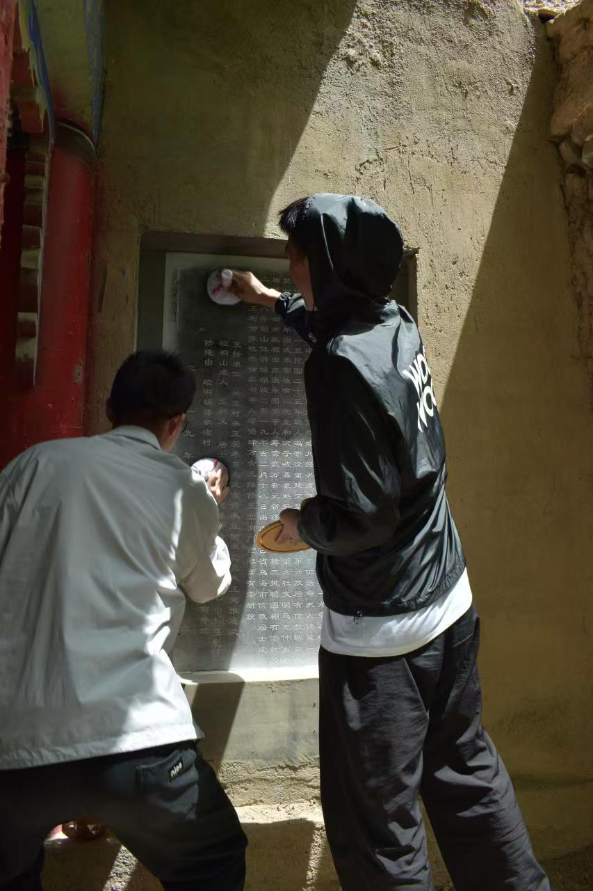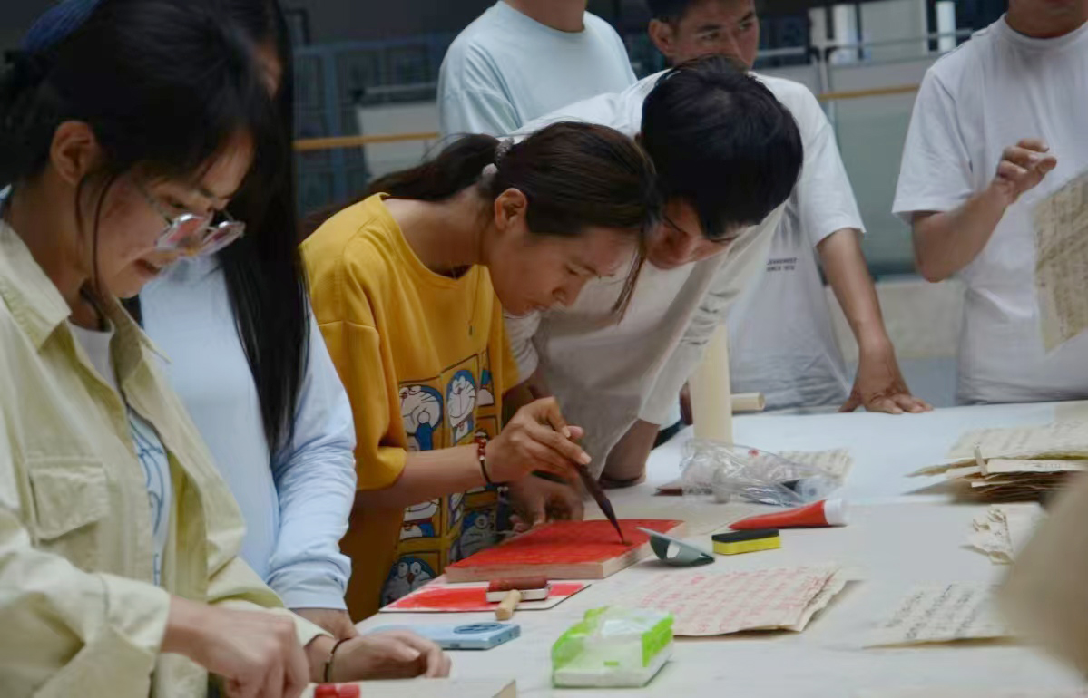 活动中,师生们亲手体验传统技艺的魅力。他们用软毛刷轻轻清扫准备好的石碑或雕刻模具表面,去除灰尘和杂质。再将宣纸覆盖在上面,用喷水壶均匀喷水,使宣纸湿润并与表面紧密贴合。使用棕刷轻轻敲打宣纸,让文字和图案的轮廓显现出来。最后,用拓包蘸取适量墨汁,从边缘开始轻轻拍打,逐渐加深颜色,随着图案逐渐清晰,一幅精美的拓片跃然纸上。