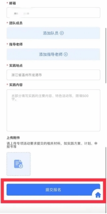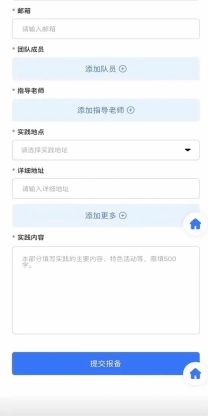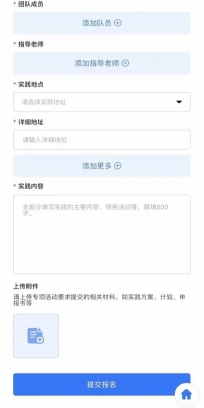 团队负责人(学生队长)根据页面提示填写团队信息、团队成员和指导老师信息,根据项目要求完善实践内容、上传附件等,确认无误后点击【提交报名】。团队报名申请将提交至专项发布单位审核。相关单位在查看材料后确定录取或拒绝,被录取的团队自动完成报备,被拒绝的团队自动解散。在本界面下,每名学生只能作为团队负责人(学生队长)组建一支实践团队进行专项活动报名,团队被拒绝后可另行报名其他专项活动。
