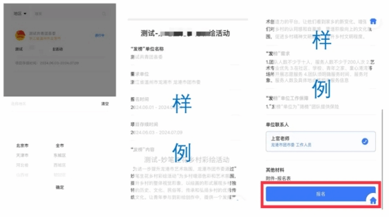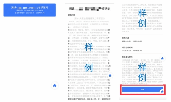 在首页点击【专项活动团队】进入专项活动项目列表,点击具体专项活动,进入详情页查看,在页末点击【报名】。