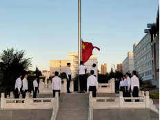 英姿飒爽的国旗班护卫队沐浴晨曦,迈着矫健的步伐,走向升旗台,在旋律激昂的国歌声中鲜红的五星红旗像一团炽热的火焰迎着朝阳冉冉升起,全体师生肃立向国旗行注目礼。让我们共同祝福伟大的祖国妈妈繁荣富强。