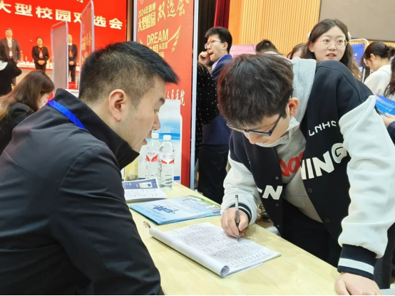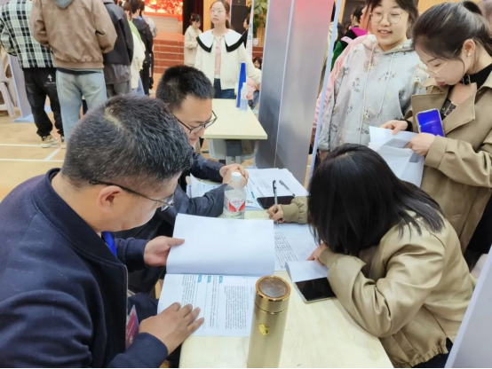 双选会现场人头攒动、气氛热烈,同学们求职热情高涨,毕业生们仔细浏览招聘海报内容,主动了解用人单位的情况,和招聘单位积极沟通交流,积极投递简历。双选会现场也吸引了很多低年级同学来现场观摩,提前感受就业氛围为日后学习和求职做好准备。