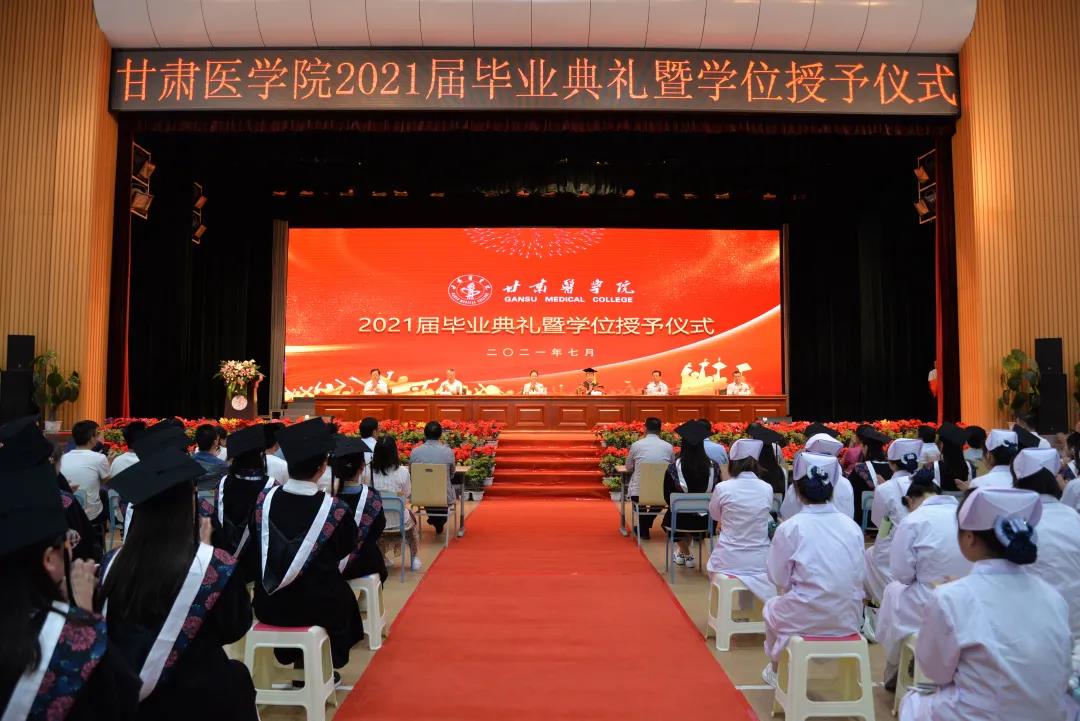 典礼在庄严的国歌声中拉开帷幕。李诚宣读了《甘肃医学院学位委员会关于印发2021届本科毕业生学士学位的授予决定》,雷鹏举宣读了《中共甘肃医学院委员会 甘肃医学院关于表彰2021届优秀毕业生的决定》。王坤为获得学士学位的毕业生代表拨穗正冠、颁发学位证书。学院领导为2021届优秀毕业生颁发荣誉证书和奖牌。