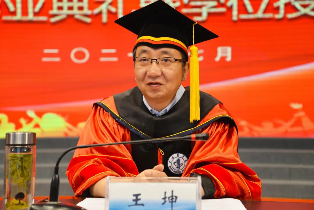 王坤希望每一位毕业生能涵养家国情怀,拥有中国心、树立报国志、怀揣中国梦,把个人的理想追求融入党和国家事业之中,与时代共成长、与祖国共奋进。用关爱驱散病人心灵的寒冷,用医术解除患者身体的病痛,在守护人民健康的不懈奋斗中放飞青春梦想,在维护生命尊严的生动实践中书写人生华章!在未来新的征程中,同学们能崇尚博学,树立“梦想从学习开始、事业靠本领成就”的观念,紧跟医学发展步伐,保持旺盛的学习力,不断探索未知领域,勇攀医学高峰,以真才实学服务人民,以创新创造贡献社会,为健康中国贡献自己应有的力量。他表示,甘医永远是你们的港湾,永远是你们的摇篮,希望全体毕业生常回家看看,在甘医汲取前进的动力,在甘医重拾奋斗勇气!