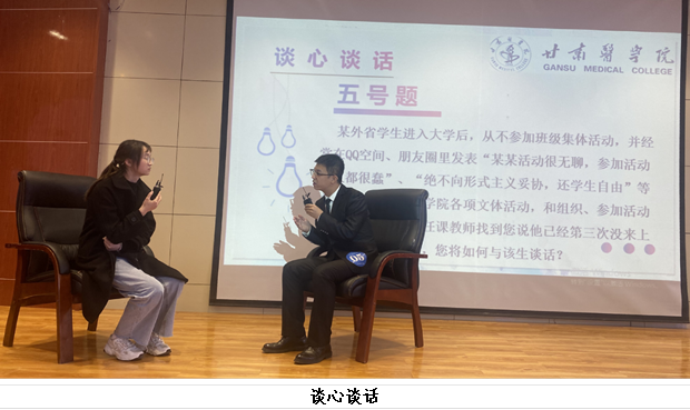 谈心谈话环节以情景再现的方式开展,考察班主任、辅导员对学生特征、学生成长成才规律的了解把握程度和对学生的教育引导能力、解决理论困惑和实际问题的能力。参赛选手认真倾听学生所遇到的困惑,把握学生特征,运用相关政策,或细致耐心,或谆谆教导,充分展示了娴熟的工作技能和特色的工作方法,彰显班主任、辅导员“人生导师和知心朋友”工作本色。