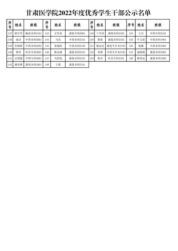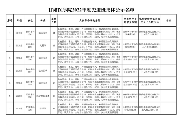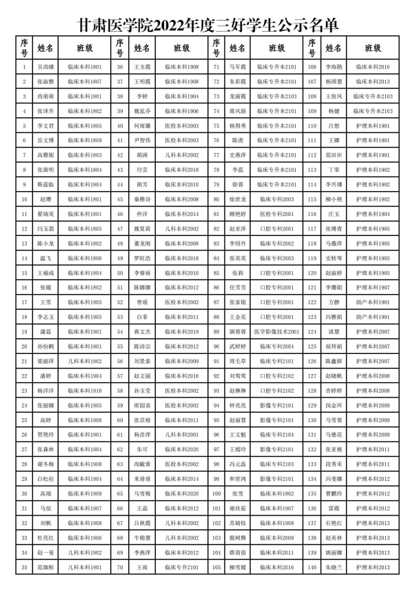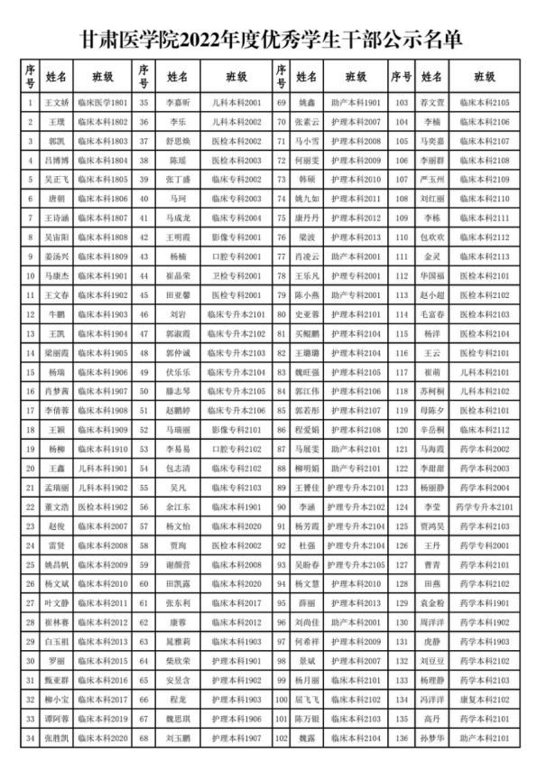 根据《甘肃医学院关于印发<甘肃医学院三好学生、优秀学生干部和先进班集体评选办法》(甘医发〔2021〕151 号),我院2022年度三好学生、优秀学生干部和先进班集体评选工作于3月初由学生工作部按照评选办法、并参照2021年度评选情况,拟定并下发了《甘肃医学院关于做好2022年度三好学生、优秀学生干部和先进班集体评选工作的通知》,组织各院系开展了评选工作,经2023年3月24日学院院长办公会议、2023年3月31日党委会议研究,决定推荐临床医学系吴尚臻等257名学生为甘肃医学院2022年度三好学生,临床医学系王文娇等158名学生为甘肃医学院2022年度优秀学生干部,临床医学系临床医学专业本科1907班等15个班级为甘肃医学院2022年度先进班集体。现将推荐名单(具体名单见附件)予以公示,公示时间为5个工作日(2023年3月31日——2023年4月6日)。