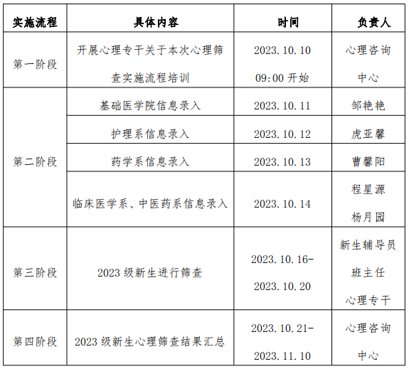 此次筛查以班级为单位集中实测,依托中国大学生心理健康测评系统进行测评。筛查数据处理由我院心理咨询中心严格按照心理筛查相关要求进行。具体安排如下: