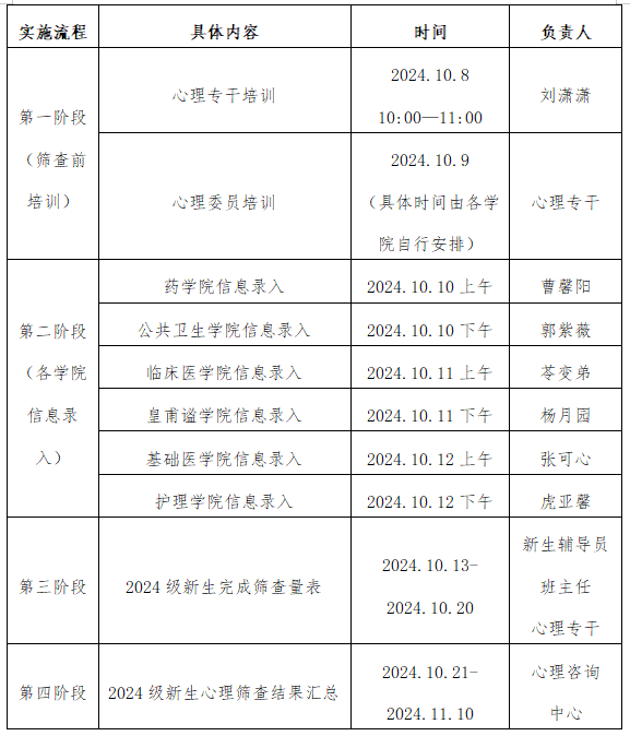 此次筛查以班级为单位集中实测,依托中国大学生心理健康测评系统进行测评。筛查数据处理由我院学工部心理咨询中心严格按照心理筛查相关要求进行。具体安排如下: