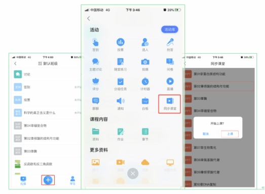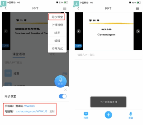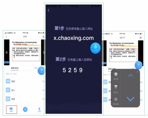 突破师生空间距离限制,在非面对面的情况,可以看到教师正在授课的PPT,并同时听到教师的授课声音,满足师生远程课堂教学所面对的困扰。在教室内,教师可以将教学课件投屏到教室的投影仪上,教室内的同学可以直接在课堂进行课程学习并与教师进行课堂互动;不在教室的同学同样可以通过同步课堂功能看到教师PPT动画,同步教师的授课声音,身临其境,并同时参与课堂互动