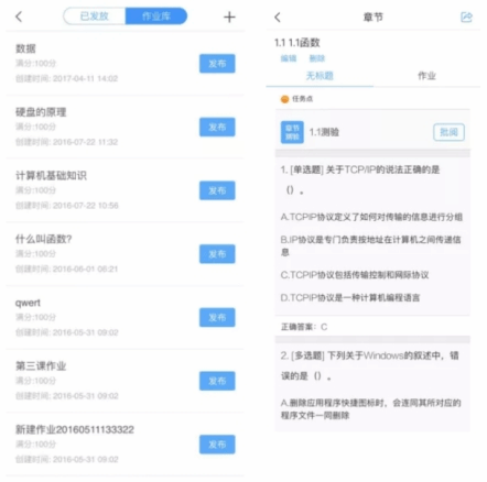关联好教学平台课程后,老师可以进行课程建设,包括章节内容、资料、作业等。在章节内容中,可以插入各种丰富的教学资源,包括视频、文档、文字、图片、音频、公式等,并可以插入超星的图书、学术视频等。老师也可以通过示范教学包建课,直接引用示范教学包内优质的教学资源。