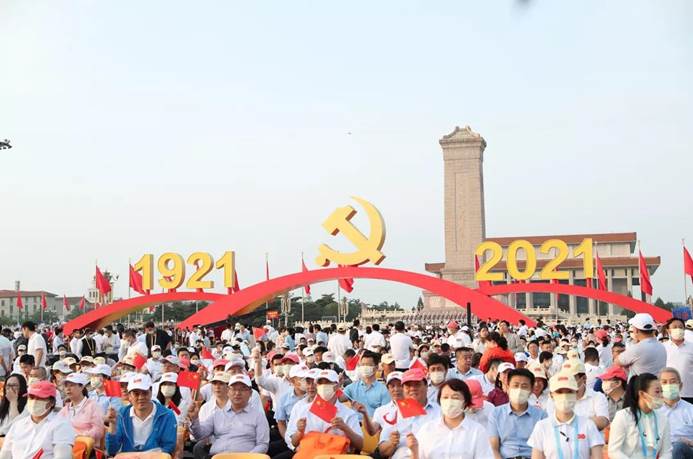 7月1日上午8时,庆祝中国共产党成立100周年大会在北京天安门广场隆重举行。这是党的盛典,这是人民的节日。中共中央总书记、国家主席、中央军委主席习近平庄严宣告——经过全党全国各族人民持续奋斗,我们实现了第一个百年奋斗目标,在中华大地上全面建成了小康社会,历史性地解决了绝对贫困问题,正在意气风发向着全面建成社会主义现代化强国的第二个百年奋斗目标迈进。这是中华民族的伟大光荣!这是中国人民的伟大光荣!这是中国共产党的伟大光荣!