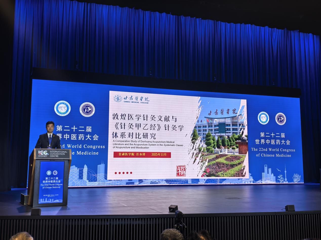 甘肃医学院代表团受邀出席大会。学校党委书记汪永锋教授作为特邀专家,在综合学术报告会场作《敦煌医学针灸文献与〈针灸甲乙经〉针灸学体系对比研究》主旨报告;皇甫谧学院王利军教授则以《皇甫谧针灸“道法术”体系的理论溯源与结构解析》为题交流学术论文,向国际中医药学界系统展现了皇甫谧医学的深厚学术底蕴与独特魅力。