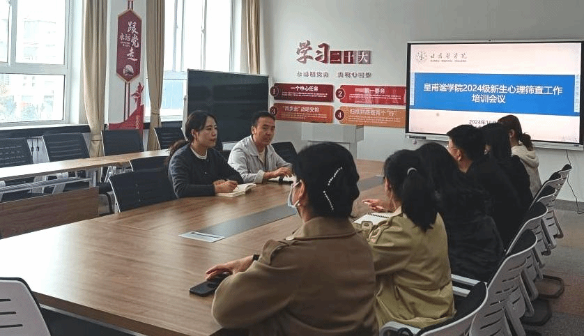 为了进一步加强学生心理健康教育,确保2024级新生心理筛查工作的顺利进行,皇甫谧学院于2024年10月9日下午在院党团活动室开展了心理筛查前工作培训。皇甫谧学院副院长宋巧、心理专干杨月园、班主任苗冲和李健健及新生班级心理委员参加了此次会议。
