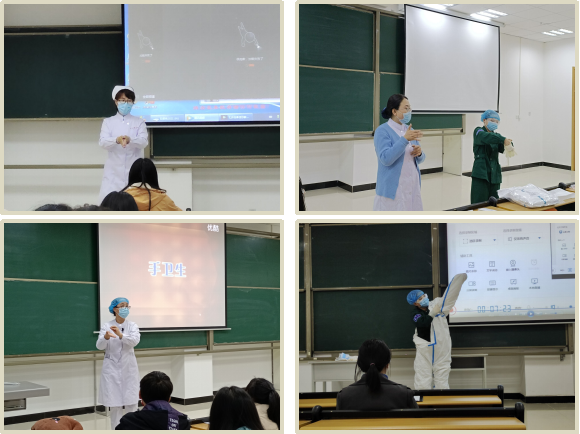 培训开始,各位老师围绕新冠肺炎感染防控要点,重点对职业防护知识和实际操作技能进行培训,培训现场依次为学生代表演示防护用品使用操作流程,特别对穿脱隔离衣、穿脱防护服、咽拭子采集、七步洗手法的方法步骤与注意事项进行了细致的讲解和演示,过程中老师采取与同学互动的新型授课方式,让学生代表更加深刻的了解到正确穿脱隔离衣和防护服的重要性。最后,老师在培训中说道:“疫情防控,没有谁是‘局外人’,作为医学生的我们更是如此。养兵千日,用兵一时,作为一个医学生,就应该冲在抗击疫情的最前线,保卫人民,守护家园”,此次培训随着老师的话音渐渐落幕,取得圆满成功。
