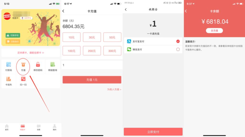 2.若发现卡余额与充值后的不一致,请拿实体校园卡到一卡通中心圈存。