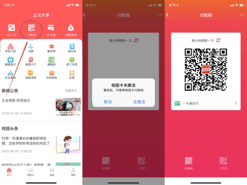 四、在支持扫码的机具上付款时,打开首页付款码,出示付款码即可付款(首次使用需输入电子校园卡密码,密码为身份证号后六位,X用0代替)。