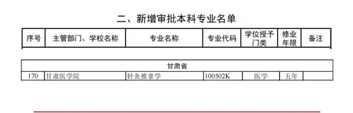 近日,教育部发布了2022年度普通高等学校本科专业备案和审批结果,甘肃医学院申报的针灸推拿学专业成功获批,针灸推拿学为甘肃省唯一新增审批本科专业,学制五年,毕业授予医学学士学位。截至目前,学院现有本科专业将增加到10个,分别为:临床医学、护理学、药学、医学检验技术、中药学、康复治疗学、助产学、儿科学、预防医学以及针灸推拿学。