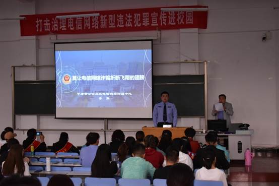 为了深入贯彻“全民防电诈·全社会反电诈”宣传活动,积极开展学院师生防范电信网络诈骗宣传工作,提高师生 防范意识及识诈、防诈能力,达到全民反诈的良好社会效果,5月20日,学院特邀平凉市反诈中心民警,一级警员,反诈中心96110预警防范负责人李墩警长,为学院师生作题为《莫让电信网络诈骗折断飞翔的翅膀》的防范电信诈骗知识专题讲座。