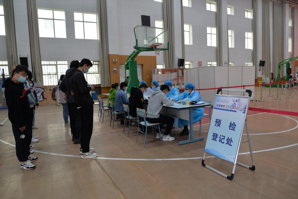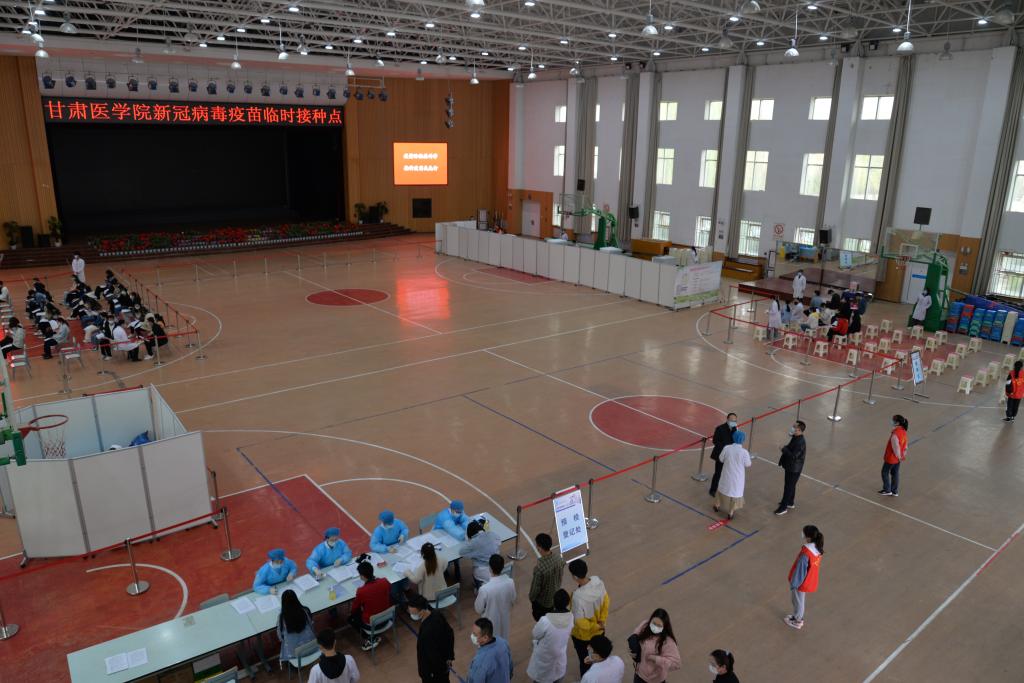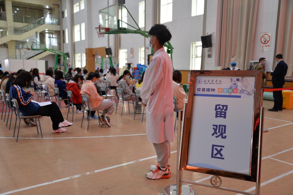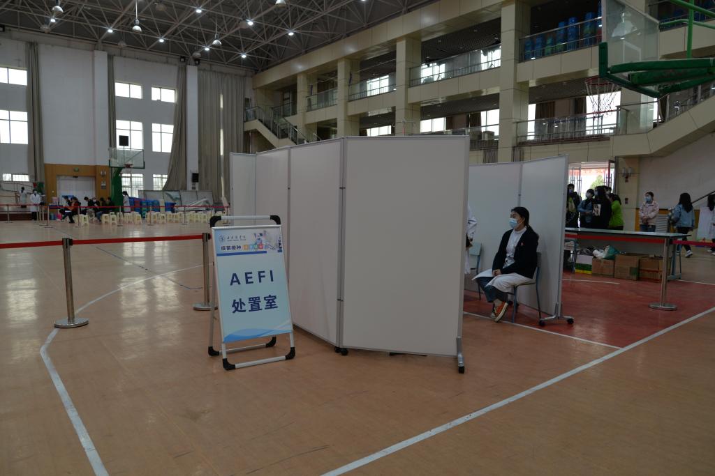 本次疫苗接种点设置在学院体育馆,划分为预检登记处、侯种区、接种区、留观区、AEFI处置区等功能区域,设置接种台5个,各区域都摆放了统一标识的指示牌,配备了志愿工作者,以便师生快速定位、有序接种。崆峒区疾控中心、铁路新村社区卫生服务中心承担接种点设立、预检分诊、建卡接种工作,附属医院全程应急保障。