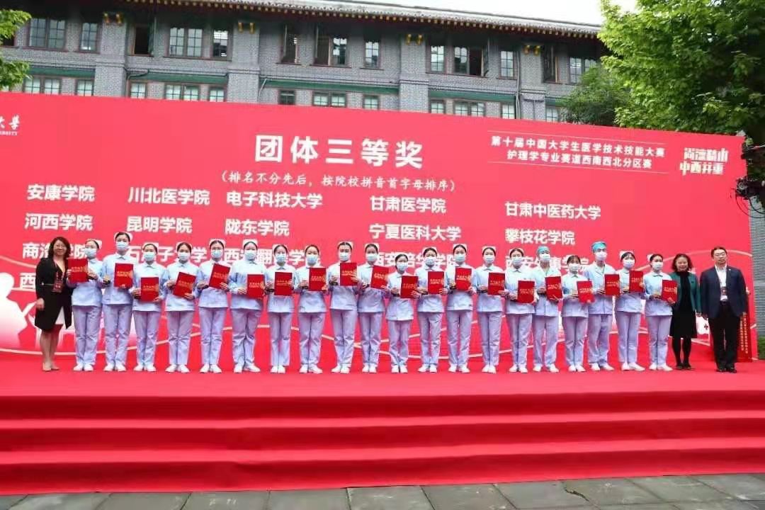 4月17日至18日,由教育部主办、教育部高等学校护理学类教学指导委员会学术指导、四川大学承办的第十届中国大学生医学技术技能大赛护理学专业赛道西南西北分区赛在成都举办。甘肃医学院护理系组织参赛学生吴海龙、李慧、周蓉、杜国斌,在系主任孔玉涛的带领下,积极进取、努力拼搏,最终荣获团体三等奖。代表队的优秀表现,展现了学院护理学子临床分析、应急判断、人文关怀、护患沟通、团队合作等综合能力。