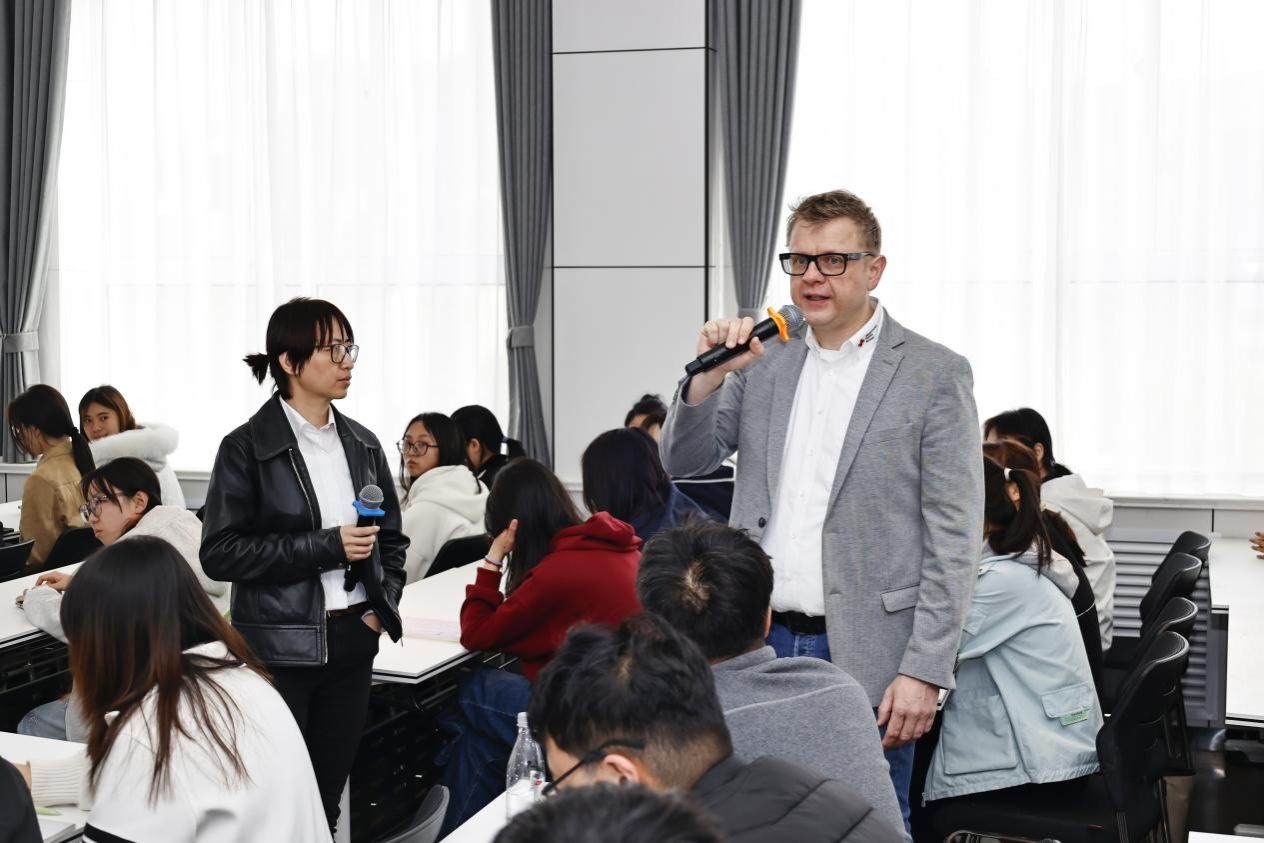 当日上午,分会总经理马尔库斯·卢克戴什尔、人力资源主任陈晨,共同为我校护理学院师生代表作了题为《德国养老护理现状》的主题讲座。讲座结合德国老龄化社会的背景,系统介绍了德国养老护理体系的结构特点、服务模式、人才培养标准以及红十字会在该领域发挥的重要作用。并从中德两国养老护理现状对比出发,围绕项目课程设置、赴德实习就业路径、跨文化适应等内容,向在场师生进行了详细的项目宣介。