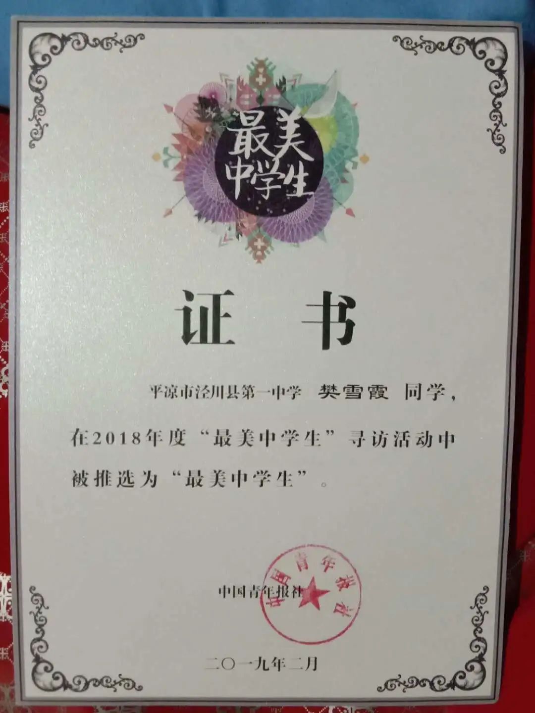 2019年2月被中国青年报社评为“全国最美中学生”荣誉称号;