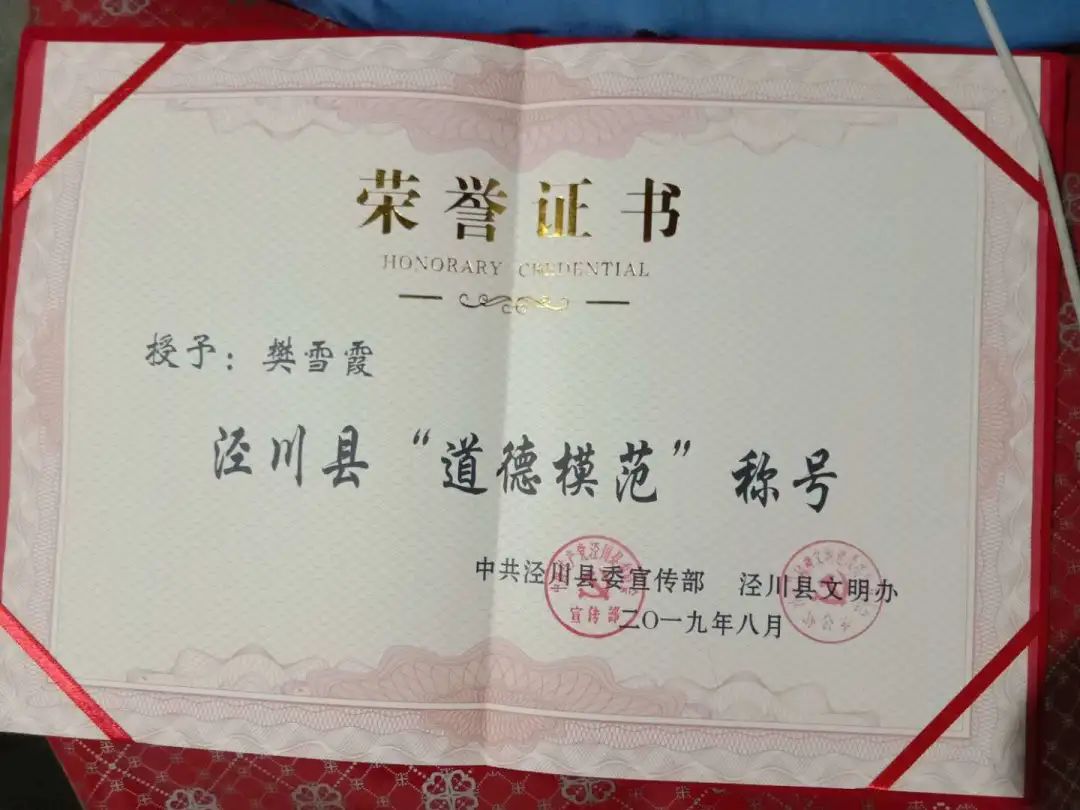 2019年8月被中共泾川县委宣传部、泾川县文明办评为泾川县“道德模范”称号。
