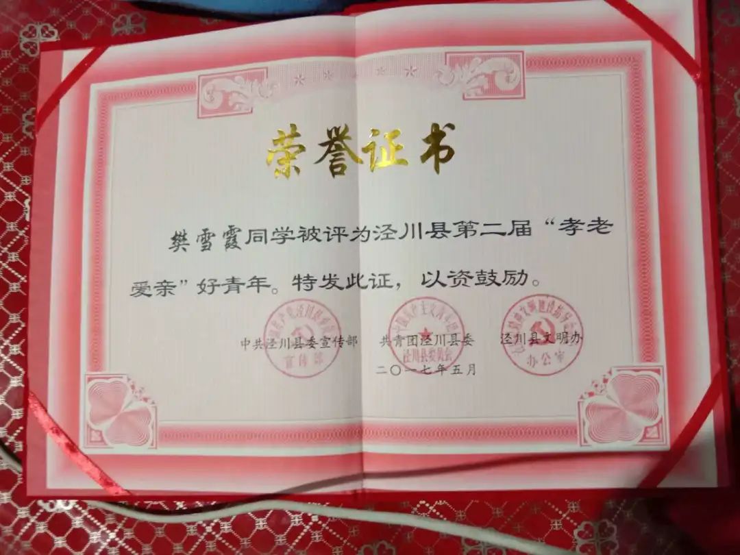 2017年5月,樊雪霞被中共泾川县委宣传部、共青团泾川县委和泾川县文明办评为泾川县第二届“孝老爱亲”好青年;