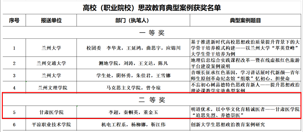 在各地各校遴选推荐的基础上,甘肃省教育厅组织专家对报送的典型案例和优秀论文进行了遴选,评选出高校(职业院校)获奖典型案例25个,高校(职业院校)优秀论文36个,我院马克思主义学院李超、秦帼英、董金玉老师的典型案例《明道优术,以中华文化育精诚医者——甘肃医学院“追思先烈、养德崇医”》在本次学校思想政治教育工作典型案例和优秀论文征集活动中获高校(职业院校)思政教育典型案例二等奖。